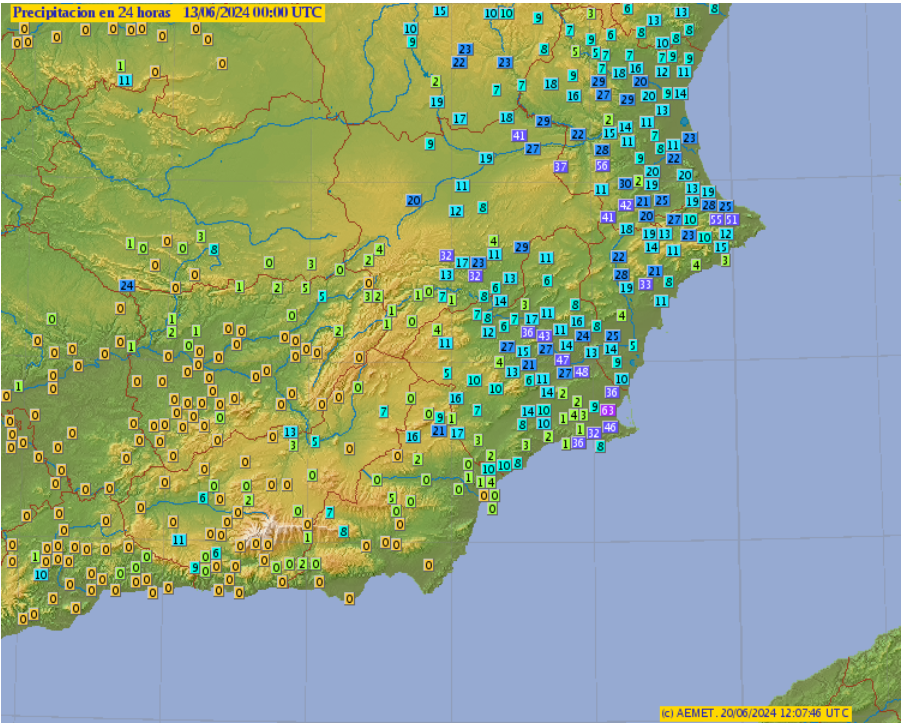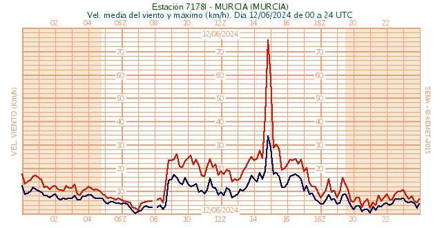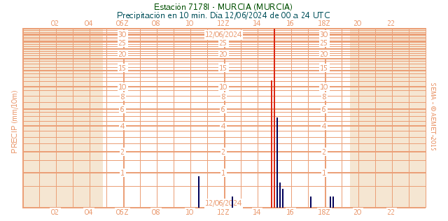 Una línea de tormentas que se dirigía desde NW de la Región de Murcia hacia el SE terminó afectando durante algo más de 40' a la capital de la Región de Murcia. Luego se dirigió hacia el campo de Cartagena, dejando también precipitaciones muy intensas en amplias zonas de esta comarca y en especial en todo el entorno del Mar Menor.