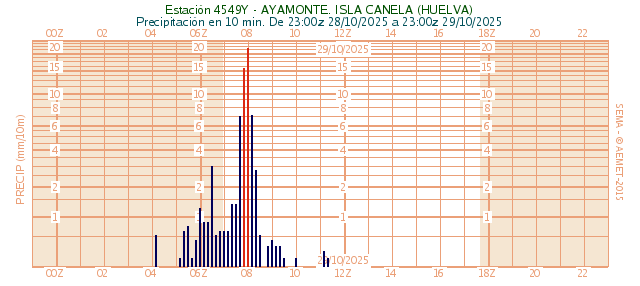 Durante la mañana del 20 de octubre de 2025 se estaba formando, al sur de Portugal, un Sistema Convectivo de Mesoscala que avanzaba hacia el este. La situación meteorológica (vaguada, con embolsamiento de aire frío en altura, una baja en superficie con frente cálido asociado, inestabilidad térmica y dinámica, y gran cizalladura vertical, sobre todo direccional) era muy favorable a la formación de células convectivas organizadas en la zona del Golfo de Cádiz. En las imágenes de satélite se aprecia el gran desarrollo de estas células, y en las de radar, una alta reflectividad, indicativo de la intensidad de las precipitaciones, que iban acompañadas de tormentas, como indicaban los registros de rayos. En Ayamonte comenzó a llover de madrugada, pero hacia las 9 h los chubascos se intensificaron, llegando a registrarse 60,5 mm en 3 horas, y cerca de 60 mm en 1 hora, con intensidades puntuales de precipitación de 115 mm/h, que produjeron numerosas inundaciones.
